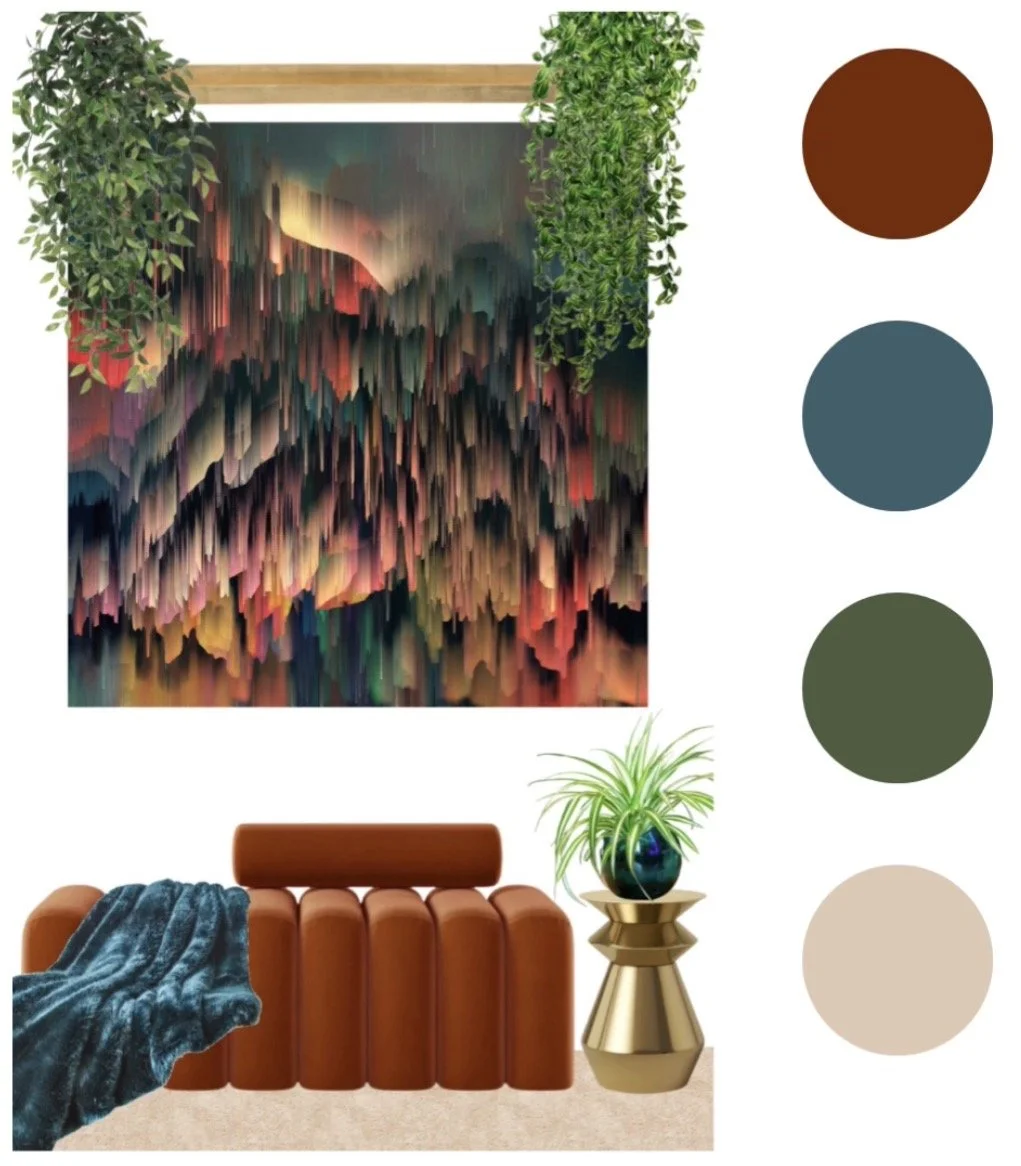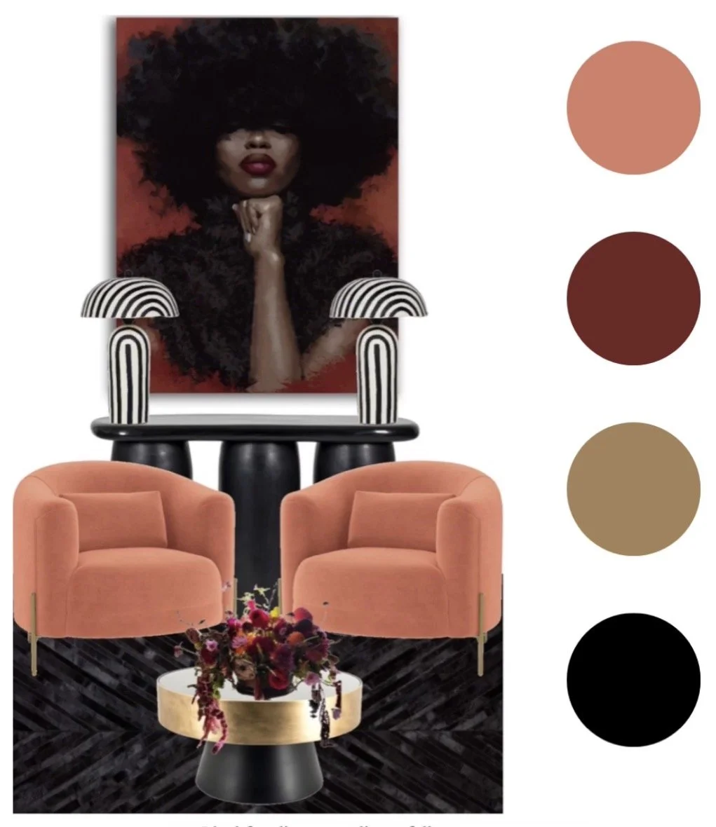 Depending on the package selected, E‑Design services may include mood boards, color palettes, layout guidance, curated product selections, custom design concepts and step‑by‑step implementation notes. Each mood board is tailored to one room, if you are needing a mood board for multiple rooms you will need to specify that in your consultation with your designer. Each package clearly outlines deliverables before booking.